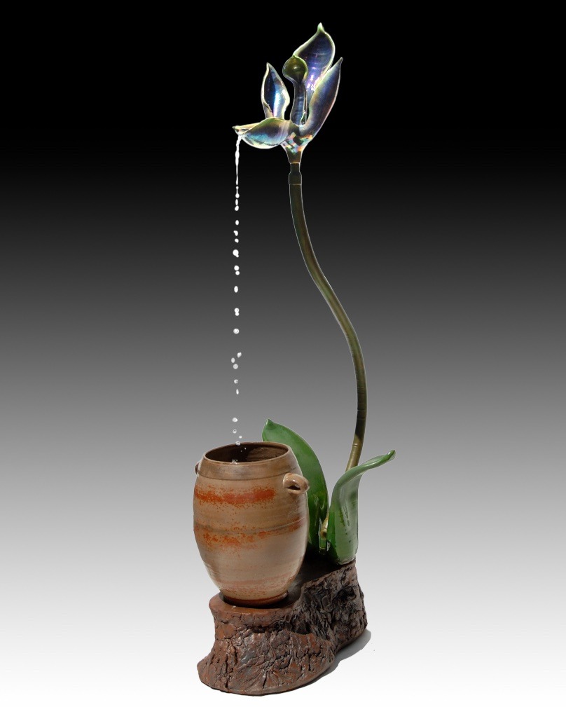 2008 78 x 19 x 33 in. Ceramic and patinated copper pipe, wheel-thrown, altered and assembled, fired to cone 6 and fumed, finished with underglazes, glaze.