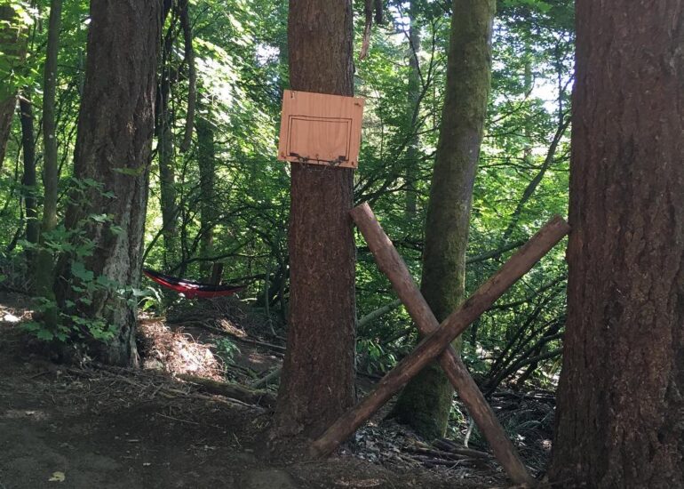 Mathias built a basketball hoop out of vine maple and added some decor to the natural court. Source[...]